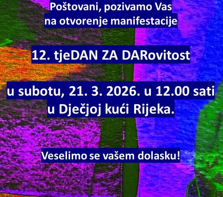 Pozivamo Vas 21. 3. 2026. godine u 12 sati na svečano otvorenje IZLOŽBE likovnih radova u sklopu Tjedna za darovitost u Dječjoj kući u Rijeci.